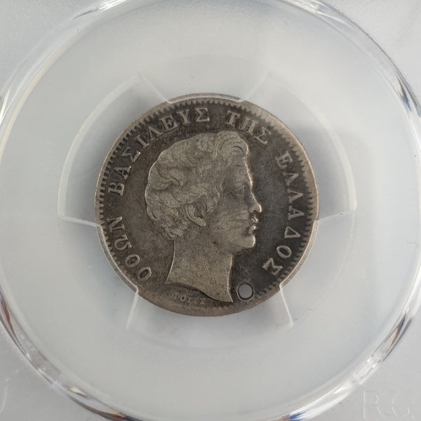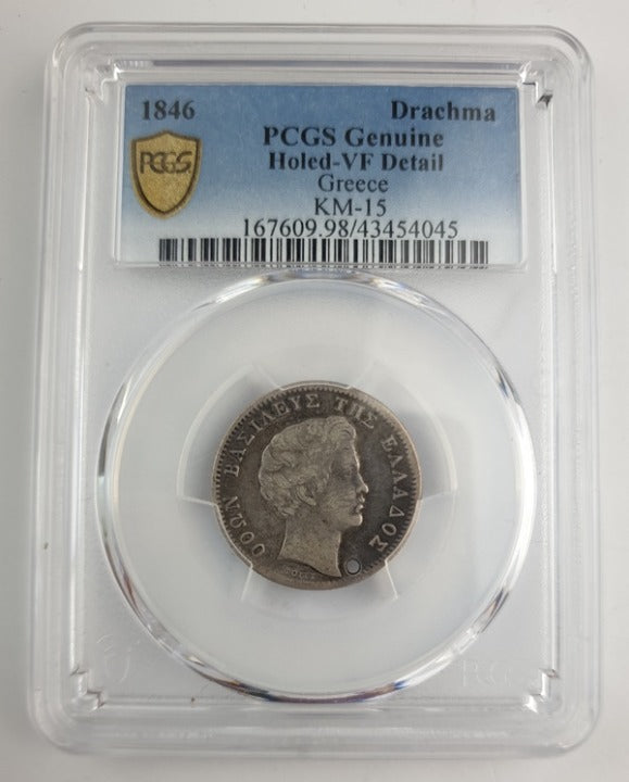 Greece - 1 Drachma 1846 (Genuine Holed-VF Detail), KM-15, Othon, Silver