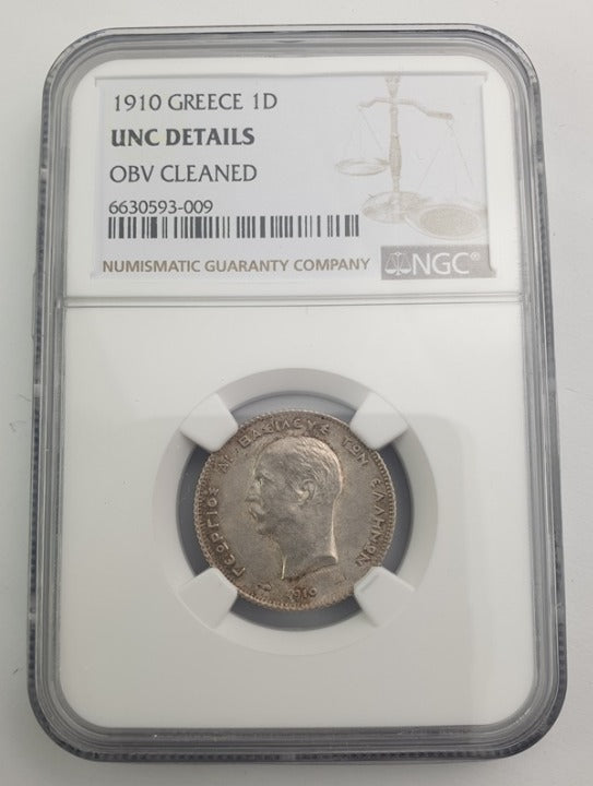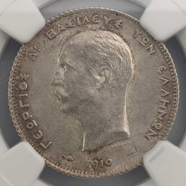 Greece - 1 Drachma 1910 (UNC DETAILS), OBV CLEANED, George I, Silver