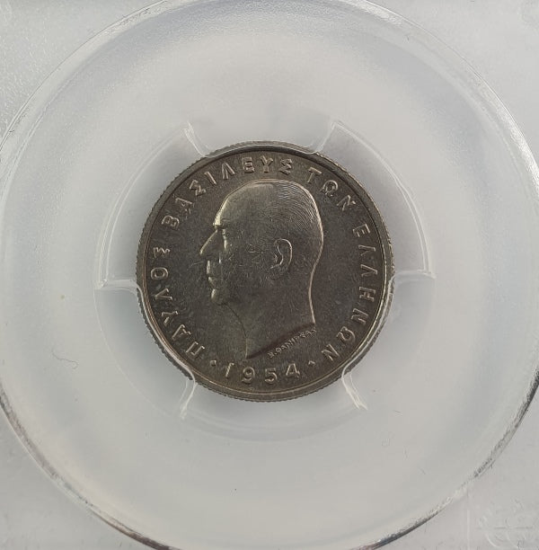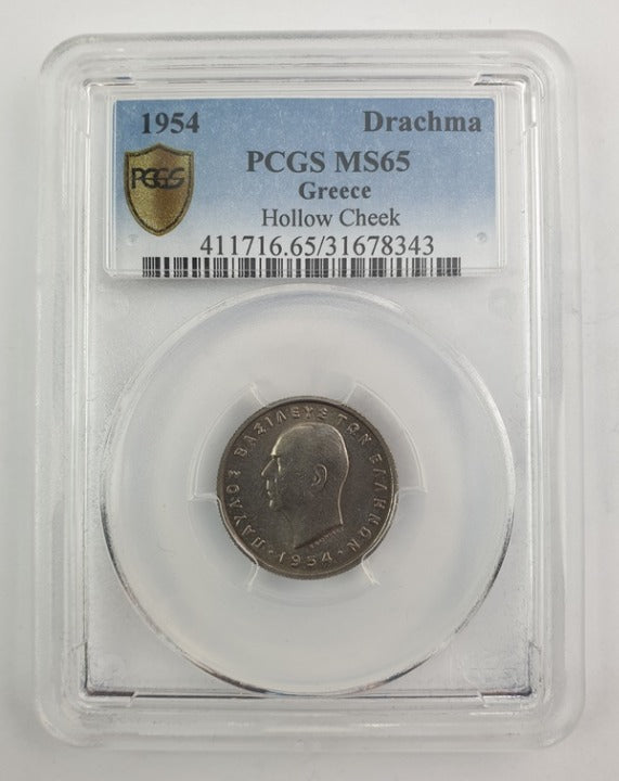 Greece - 1 Drachma 1954 (MS 65), Hallow Cheek, Paul I