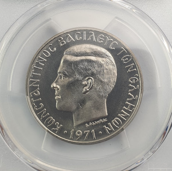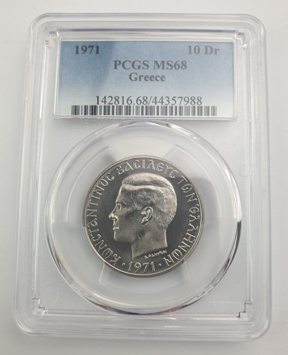 Greece - 10 Drachmas 1971 (MS 68), Constantine II top pop in both companies