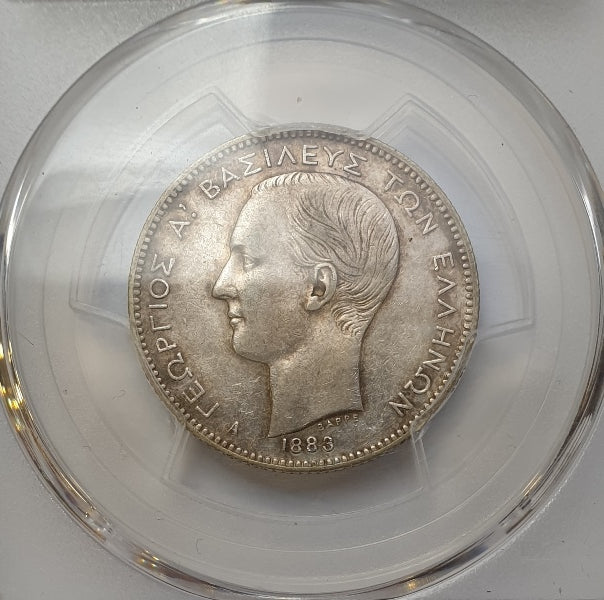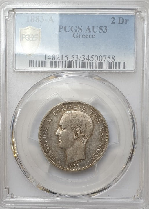 Greece - 2 Drachmas 1883-A (AU 53), George I, Silver