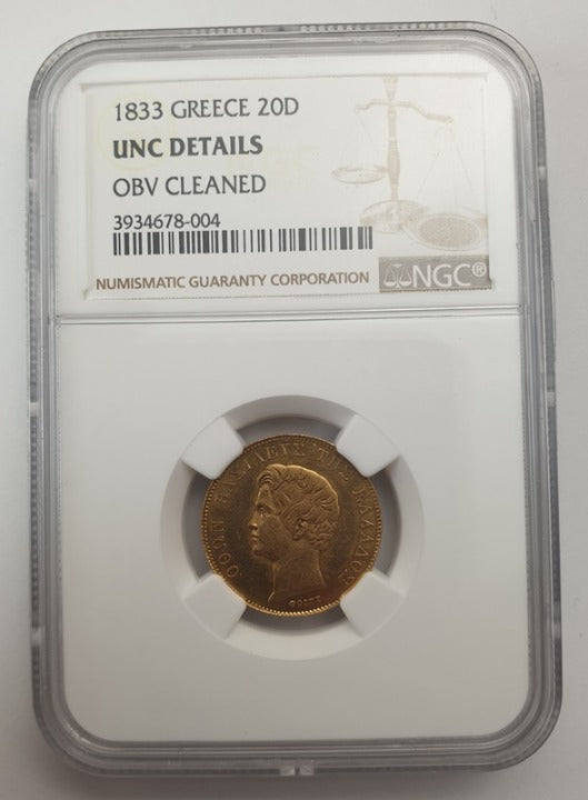 Greece - 20 Drachmas 1833 (UNC DETAILS), OBV CLEANED, Othon