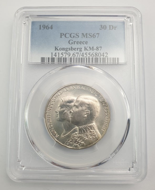 Greece - 30 Drachmas 1964 (MS 67), Kongsberg, KM-87, Constantine II, Silver