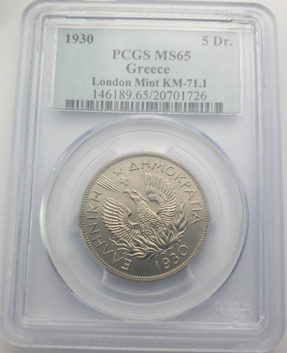 Greece - 5 Drachmai 1930 (MS 65), London Mint